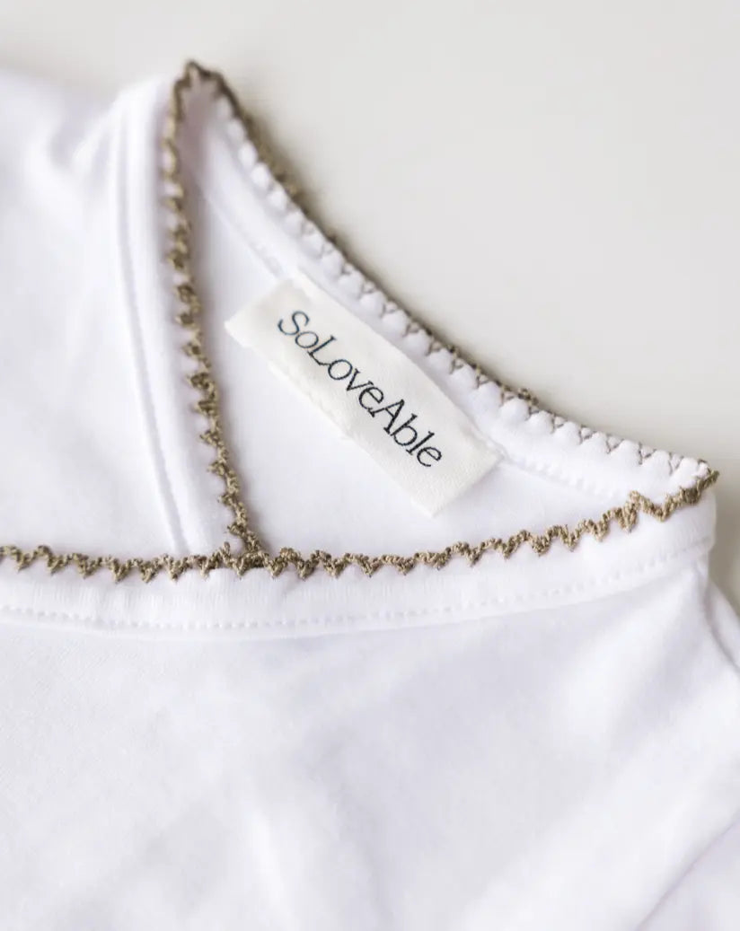Close-up of sage green crochet trim on the white baby bodysuit.